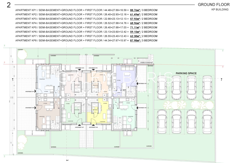 M2: 90 m2 – 126 m2 (net) / Her dairenin 12m2 Bahçesi bulunuyor + Otopark